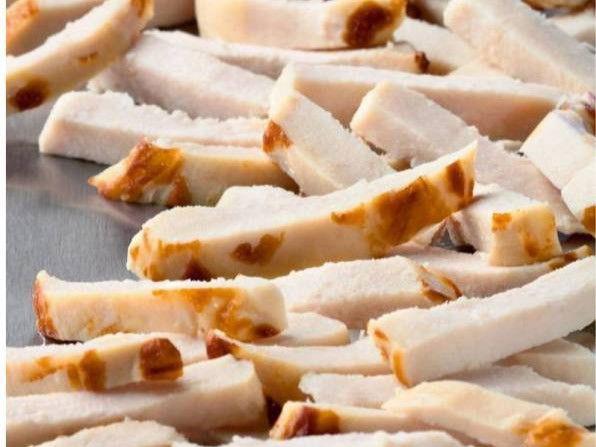 Her får du 2 kg. kogte og forstegte kyllingestrimler i super kvalitet!