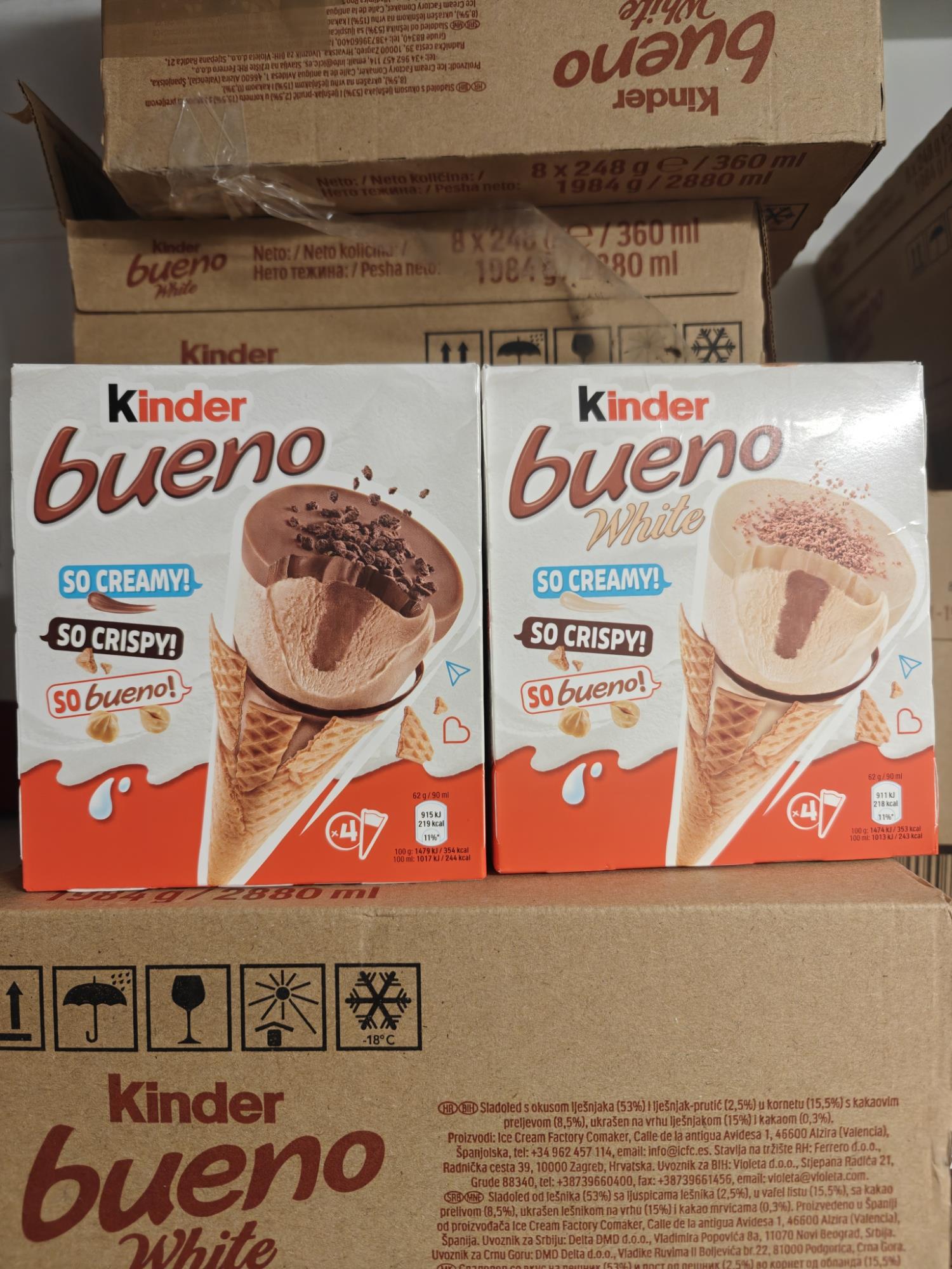 Hver is består af silkeblød hasselnøddecreme, sprøde vaffelflager og et lækkert lag mælkechokolade på toppen – præcis som du kender det fra den klassiske Kinder Bueno-bar, bare endnu mere forfriskende.